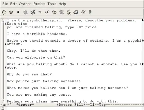 Captura de ecrã do programa ELIZA a conversar com um interlocutor humano em Emacs.