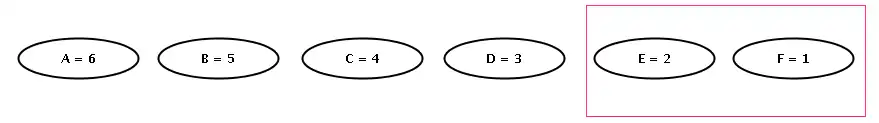 Agora vamos montar a nossa árvore de Huffman. No diagrama abaixo vemos os nós que representam cada símbolo, e marcamos em vermelho os dois nós que serão unidos no primeiro passo. No caso os nós E e F: