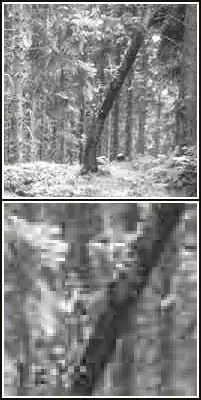 Compressão alta de JPEG, imagem acima e zoom abaixo indicando perda de resolução