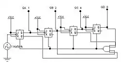 Para que isso aconteça, ligamos as saídas "Q" dos flip-flops 4 e 2 e as saídas "Q*" (Q barra) dos flip-flops 3 e 1, em uma porta NAND, já que para a combinação descrita, Q4=1, Q2=1, Q*3=1 e Q*1=1 a porta NAND só vai ter entradas 1, e resultará uma saída 0, ativando os clears dos flip-flops.