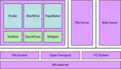 O Copland foi projetado para consistir no Mac OS sobre um micronúcleo chamado Nukernel, que lidaria com tarefas básicas, como inicialização de aplicativos e gerenciamento de memória, deixando todas as outras tarefas para uma série de programas semi-especiais conhecidos como servidores. Por exemplo, os serviços de rede e de arquivos não seriam fornecidos pelo próprio núcleo, mas por servidores que receberiam solicitações por meio de comunicações entre aplicativos.[5] O sistema Copland como um todo consiste na combinação do Nukernel, de vários servidores e de um conjunto de bibliotecas de suporte a aplicativos para fornecer implementações da conhecida interface de programação clássica do Macintosh.[6]