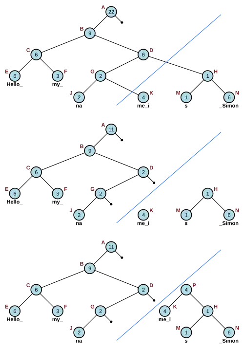 Por exemplo, para dividir a cadeia da corda ilustrada na Figura 2.3 em duas cordas iguais de comprimento 11, é necessário consultar o caracter 12 para localizar o nó K no nível inferior. Remove-se a ligação entre K e G e o algoritmo prossegue para o pai de G e subtrai o peso de K a partir do peso de D. Então, o algoritmo se move para cima na árvore e remover qualquer link direto para sub-árvores, cobrindo de caracteres passado posição 11, subtraindo-se o peso de K a partir de seus nós pais (somente o nó D e Um, neste caso). Finalmente, constrói-se os nós K e H ao concatená-los e a cria-se um novo pai P com peso igual ao comprimento da esquerda nó K.