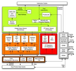 A arquitetura foi projetada para sistemas multiprocessadores. Sua primeira versão executava dois comandos em unidades diferentes, em versões posteriores de 7 a 13 estágios de pipeline são processadas, dependendo da UC e a geração do processador.
