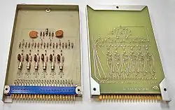 Um módulo Flip Chip série "B" (azul) contendo nove transistores, 1971