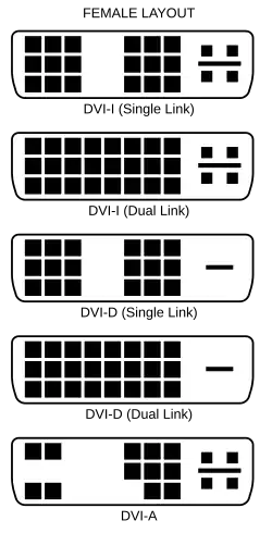 • DVI-I (Integrado - ou híbrido, combina sinais digitais e analógicos no mesmo conector; o sinal digital pode ser de link único ou duplo)
