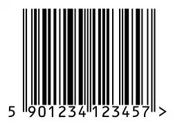 Número GTIN-13 codificado em código de barras EAN-13. O primeiro dígito é sempre colocado fora do símbolo; adicionalmente, um indicador ">" à direita é usado para indicar uma "Zona Silenciosa" que é necessária para os scanners de código de barras funcionarem corretamente. O código GS1 apresentado (590) é atribuído à Polónia.