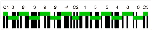 • O primeiro dígito no código EAN: a combinação de paridades dos dígitos no grupo esquerdo codifica indiretamente o primeiro dígito 4.
