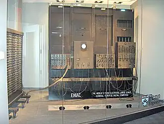 Criado pelos engenheiros John Eckert e John Mauchly na Universidade da Pensilvânia durante os anos de 1937-1943, o ENIAC tinha como objetivo principal computar dados balísticos de artilharia em altas velocidades para ajudar as tropas aliadas na Segunda Guerra Mundial. No entanto, o ENIAC só foi concluído após o fim da guerra, sendo então utilizado nos primeiros anos da Guerra Fria, tendo contribuído para o projeto da bomba de hidrogênio.[6]