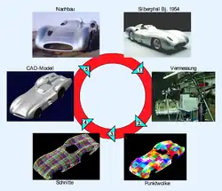 Conforme o design auxiliado por computador (CAD) tornou-se mais popular, a engenharia reversa tornou-se um método viǘel para criar modelos 3D virtuais de uma parte física existente para utiliziiar em 3D CAD, CAM, CAE, e outros softwares.[22] O processo de engenharia reversa envolve a medição de um objeto e então reconstruí-lo como um modelo tridimensional. O objeo físico pode ser medidio utilizando tecnologias de escaneamento 3D tais como CMMs, scanners a lase, tomografia computadorizada, etc. Fazendo a medição dos dados separadamente, geralmente representados como uma nuvem de pontos, fornecem informações insuficientes a respeito de aspectos topográficos e de intenção de design. A forma pode ser recuperada por meio da conversão da nuvem de pontos em uma malha de face triangular. A engenharia reversa tem por objetivo ir além de produzir tal malha e recuperar a intenção de design quando se trata de aspectos de superfícies analíticas simples, quando adequado, bem como, possivelmente superfícies NURBSS para produzir um modelo CAD de representação de limites.. A recuperação de tal modelo permite que um design seja modificado para atender a novos requisitos, um plano de fabricação seja gerado, etc.