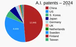 - 1 2 Buntz, Brian (3 de novembro de 2024). «Quality vs. quantity: US and China chart different paths in global AI patent race in 2024 / Geographical breakdown of AI patents in 2024». R&D World. Cópia arquivada em 9 de dezembro de 2024