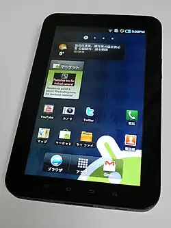 O Samsung Galaxy Tab é um tablet compacto produzido pela Samsung rodando o sistema operacional Android.[2] O aparelho teve sua estreia em Berlim, Alemanha, no dia 2 de setembro de 2010.[3] Possui uma tela LCD touchscreen de 7 polegadas (ou 180mm), acesso a Wi-Fi, processador ARM Cortex-A8 ("Hummingbird") de 1,0 GHz, sistema de entrada Swype.[4] O tablet também é equipado com uma câmera de 3,2 MP na parte traseira e outra câmera com 1,3 MP na parte frontal para chamadas de vídeo. O Samsung Galaxy Tab, no seu lançamento, veio equipado com o Android 2.2.[5]