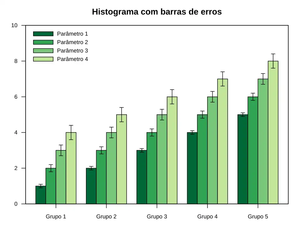 Grupo 5 5.0 0.1 6.0 0.2 7.0 0.3 8.0 0.4O arquivo contem dados de cinco grupos (Grupo 1 a Grupo 5) de quatro parâmetros (Param1 a Param4) além dos erros associados (Erros1 a Erros4). Para criar um gráfico com esses dados podemos usar o código abaixo: