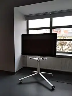 O dispositivo pode ser montado em uma parede ou, por padrão, ser montado em um suporte vertical com rodas. [5]