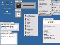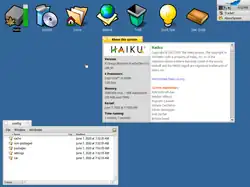 Haiku, conhecido anteriormente como OpenBeOS,[1] é um sistema operacional de código aberto para plataforma x86 que tenta manter retrocompatibilidade com o agora descontinuado, BeOS. Seu desenvolvimento começou em 2001 e tornou-se self-hosting em 2008. A primeira versão alfa foi feita em Setembro de 2009, e a primeira versão beta mais recente em Setembro de 2018; o desenvolvimento continua ativo em 2018, com "nightly images".[2]