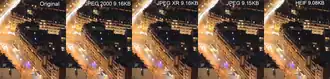 ![]() Comparação dos arquivos JPEG, JPEG 2000, JPEG XR e HEIF em tamanhos de arquivo similares | |