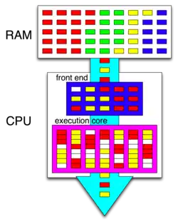 Em processadores com essa tecnologia, fisicamente cada um dos processadores lógicos tem seu próprio conjunto de registradores e controlador de interrupção, e o restante dos elementos do processador são comuns (ALU, Cache, barramentos). Quando ocorre uma pausa no fluxo de execução de um dos processadores - por exemplo, quando há a necessidade de buscar dados na memória, o controle é transferido para o fluxo do outro processador lógico. Assim, enquanto um processo está esperando por esses dados da memória, os processadores físicos são usados para executar outro processo.