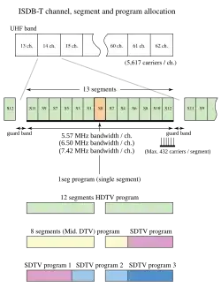 - A banda de RF de 6 MHz (megahertz) foi subdividida em 13 segmentos independentes, com a possibilidade de serem enviadas 3 programações diferentes ao mesmo tempo, por exemplo: uma em QPSK, outra em 16QAM e a terceira em 64QAM;