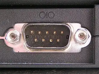 Um conector "macho" do tipo "DB" (DE-9) para porta série.