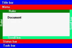 - ↑ Tradução dos termos estrangeiros usados na imagem: title bar — barra de título; ruler — régua; document — documento; scroll bar — barra de rolagem; status bar — barra de status; task bar — barra de tarefas.