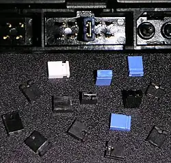 Os jumpers devem ser condutores elétricos; eles geralmente são envoltos em um bloco de plástico não condutor por conveniência. Isso também evita o risco de um jumper não blindado causar acidentalmente um curto-circuito em algo crítico (principalmente se cair em um circuito ativo).