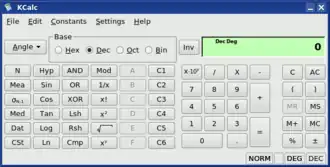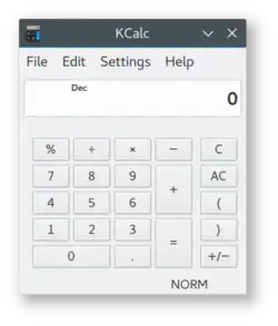 Kcalc é um software de calculadora integrado com o ambiente desktop KDE. Em sua visualização padrão, ele inclui um teclado numérico, botões para somar, subtrair, multiplicar e dividir, colchetes, teclas de memória, porcentagem, inverso, fatorial, quadrado, raiz quadrada e x elevado a y.