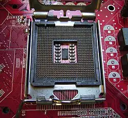 Processador: [...] Os modelos comuns atualmente podem ser encaixados em um soquete [...] ou LGA (Land Grid Array). [...] Junto com o Pentium 4 com núcleo Prescott, a Intel lançou um novo padrão de soquete, o LGA (Land Grid Array). Ele não é um soquete do padrão slot (para processadores em cartucho), mas também é totalmente diferente do habitual padrão ZIF. Para começar, processadores que utilizam esse tipo de soquete não possuem pinos — os pinos ficam no próprio soquete. [...] Outra mudança do padrão LGA é a forma de fixar o processador ao soquete: agora uma armadura de metal envolve e protege o processador e boa parte da pressão que o dissipador de calor exercia sobre o processador é absorvida pela armadura de metal.