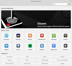 - Loja de aplicativos (mintInstall): Projetado para instalar o software dos repositórios de software Ubuntu e Linux Mint, bem como os PPAs do Launchpad. Desde o Linux Mint 18.3, também foi capaz de instalar software a partir de controles remotos Flatpak e é configurado com o Flathub por padrão. Ele possui uma interface fortemente inspirada no GNOME Software e é construída sobre o GTK3.[61][69]
