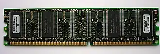 DIMM - Dual Inline Memory Module (Módulo de Memória em Linha Dupla), é um dos tipos de encapsulamento para memória DRAM mais utilizados na atualidade. Os pentes DIMM de memória estão divididos basicamente em dois tipos: SDR SDRAM e DDR SDRAM. São classificadas também segundo a quantidade de vias (contatos) que possuem: a SDR SDRAM possui 168 vias, a DDR SDRAM apresenta 184 vias, DDR2 SDRAM, 204 vias e a DDR3 SDRAM 240 vias. Ao contrário dos arranjos de memórias SIMM, estes módulos possuem contatos em ambos os lados do pente, e daí veio o termo DIMM. São módulos de 64 bits, não necessitando mais utilizar o esquema de paridade das antigas memórias SIMM (Single Inline Memory Module), onde era necessário instalar bancos de memória em múltiplos de dois módulos.[2]