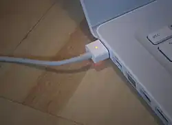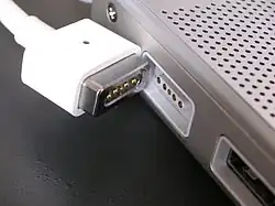 ![]() Conector MagSafe de primeira geração no MacBook Pro | |||