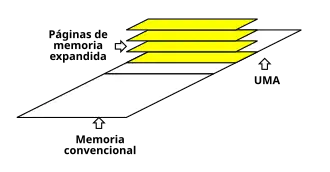 Memória expandida era um sistema de comutação de bancos introduzido por volta de 1984 e que disponibilizava mais memória para programas corporativos volumosos em ambiente MS-DOS. Tais programas eram geralmente planilhas eletrônicas e SGBDs executados no IBM PC original e em seus sucessores, como o IBM PC-XT e o IBM PC/AT. O IBM PC e o IBM XT possuíam arquitetura de memória em modo real, a qual somente permitia aos programas usar até 1 megabyte do espaço de endereçamento, sendo que apenas 640 KiB estavam disponíveis para a RAM normal (o espaço restante até 1 MiB ficava reservado para periféricos, particularmente como memória da placa de vídeo). O IBM AT, que usava a UCP Intel 80286, dava suporte ao modo protegido, mas também ao MS-DOS, um SO de modo real que não usava a memória estendida (acima de 1 MiB) diretamente.