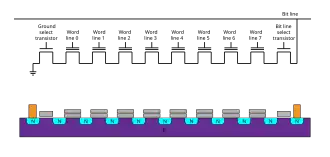 O flash NAND também usa transistores de porta flutuante, mas eles são conectados de uma maneira que se assemelha a uma porta NAND: vários transistores são conectados em série e a linha de bits é puxada para baixo somente se todas as linhas de palavras forem puxadas para cima (acima do VT dos transistores).[2] Esses grupos são então conectados através de alguns transistores adicionais a uma matriz de linhas de bits no estilo NOR da mesma maneira que transistores únicos são vinculados no flash NOR.
