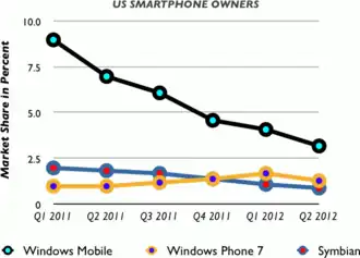 Em janeiro de 2013, Nokia relatou uma venda de 6,6 milhões de smartphones para o quarto trimestre de 2012, consistindo em 2,2 milhões de Symbian e 4,4 milhões de vendas de dispositivos Lumia (Windows Phone 7 e 8).[35] Na América do Norte, apenas 700.000 telefones móveis foram vendidos, incluindo smartphones.