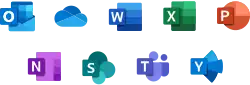 ![]() Da esquerda para direita, de cima para baixo: Outlook, OneDrive, Word, Excel, PowerPoint, OneNote, SharePoint, Teams e Yammer. | |