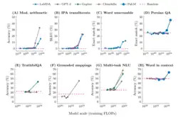 - ↑ Srivastava, Aarohi; Rastogi, Abhinav; Rao, Abhishek; Abu Awal Md Shoeb; Abid, Abubakar; Fisch, Adam; Brown, Adam R.; Santoro, Adam; Gupta, Aditya; Garriga-Alonso, Adrià; Kluska, Agnieszka; Lewkowycz, Aitor; Agarwal, Akshat; Power, Alethea; Ray, Alex; Warstadt, Alex; Kocurek, Alexander W.; Safaya, Ali; Tazarv, Ali; Xiang, Alice; Parrish, Alicia; Nie, Allen; Hussain, Aman; Askell, Amanda; Dsouza, Amanda; Slone, Ambrose; Rahane, Ameet; Iyer, Anantharaman S.; Andreassen, Anders; Madotto, Andrea (2022). «Beyond the Imitation Game: Quantifying and extrapolating the capabilities of language models». TMLR. arXiv:2206.04615