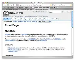 MoinMoin é um software livre escrito em Python para sistemas wiki e licenciado sob a licença GNU GPL. Possui ferramentas avançadas de colaboração para editar web páginas como: revisor ortográfico, deleção de cache, impressão, anexos e outros.