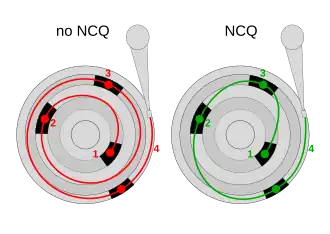 Em termos simples, a funcionalidade do NCQ é um tanto similar a um elevador. O elevador viaja sequencialmente de andar a andar e deixa as pessoas entrarem e saírem. Não segue a sequência que os usuários apertaram os botões de pedido do andar porque significaria uma carga mecânica excessiva e um tempo muito mais longo para esperar ou embarcar.