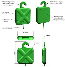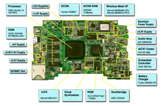 - Rede sem fio usando um chip sem fio Marvell 8388 "Extended Range" 802.11b/ge 802.11s (mesh), escolhido devido à sua capacidade de encaminhar pacotes de forma autônoma na malha mesmo se a CPU estiver desligada. Quando conectado em malha, ele é executado em uma taxa de bits baixa (2 Mbit/s) para minimizar o uso de energia. Apesar do minimalismo do chip sem fio, ele suporta Wi-Fi Protected Access (WPA).[41] Um processador ARM está incluído.