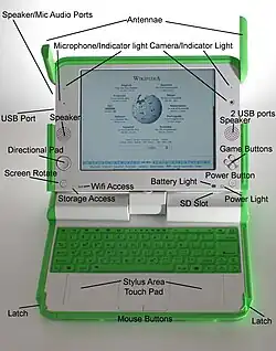 Os computadores robustos e de baixo consumo de energia usam memória flash em vez de uma unidade de disco rígido (HDD) e vêm com um sistema operacional pré-instalado derivado do Fedora Linux, com a interface gráfica do usuário (GUI) Sugar.[10] A rede ad hoc móvel via rede mesh Wi-Fi 802.11s, para permitir que muitas máquinas compartilhem o acesso à Internet, desde que pelo menos uma delas possa se conectar a um ponto de acesso, foi inicialmente anunciada, mas rapidamente abandonada depois de se provar não confiável.[11]