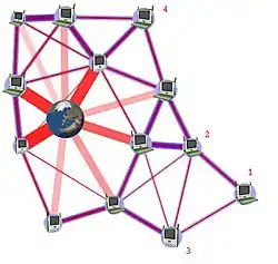 Sempre que o laptop é ligado, ele pode participar de uma rede ad hoc móvel (MANET) com cada nó operando de maneira ponto a ponto com outros laptops que ele pode ouvir, encaminhando pacotes pela nuvem. Se um computador na nuvem tiver acesso à Internet — direta ou indiretamente — todos os computadores na nuvem poderão compartilhar esse acesso. A taxa de dados nesta rede não será alta; no entanto, redes semelhantes, como o projeto store and forward Motoman[42] têm suportado serviços de e-mail para 1000 crianças em idade escolar no Camboja, segundo Negroponte. A taxa de dados deve ser suficiente para aplicativos de rede assíncronos (como e-mail) se comunicarem fora da nuvem; usos interativos, como navegação na web, ou aplicativos de alta largura de banda, como streaming de vídeo, devem ser possíveis dentro da nuvem. A atribuição de IP para a rede em malha deve ser configurada automaticamente, portanto, nenhum administrador de servidor ou administração de endereços IP é necessário.