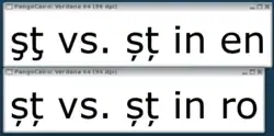 Pango 1.17 é dos mais recentes suportarem o script locl tag que permite que os glifos alternativos a serem utilizados para o mesmo ponto de código Unicode. Supondo que você tenha Verdana versão 5.01 instalado, que suporta o recurso para o script locl Latn/ROM (romeno), uma demonstração rápida (no Linux) é: