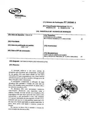 Folha de rosto do pedido de patente português, "Sistema de propulsão para bicicletas"