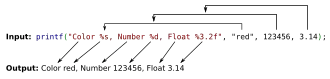 O primeiro parâmetro é uma string de formatação que descreve como os itens impressos que serão representados. Um exemplo é o uso do código %d que mostra um número inteiro e o %f que mostra um número de ponto flutuante. Por vezes, printf é utilizado para fazer o redirecionamento de uma variável ou alguma entrada imutável feito por um comando.[1]