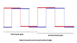 Assim como na tecnologia taxa de dados dupla, os sinais de leitura e escrita são transferidos nas bordas de subida e descida do clock.[1]