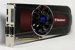 - ↑ Todos os chips possuem AMD Eyefinity, mas a placa Radeon HD 5870 Eyefinity Edition também possui seis saídas mini DisplayPort, todas as quais podem ser ativas simultaneamente.