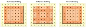 - Por vezes, é conveniente preencher a entrada com zeros (ou outros valores, como a média da região) na borda do volume de entrada. O tamanho deste preenchimento é um terceiro hiperparâmetro. O preenchimento fornece controle sobre o tamanho espacial do volume de saída. Em particular, por vezes é desejável preservar exatamente o tamanho espacial do volume de entrada, o que é comumente referido como preenchimento "igual" (same padding).