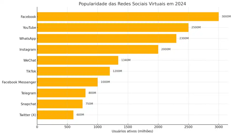 Distribuição de usuários entre redes sociais virtuais, 2024. Estimativas baseadas em dados disponíveis até 2024. Fonte dos dados estatísticos: Digital 2024 Global Overview Report (We Are Social, Meltwater, Kepios)