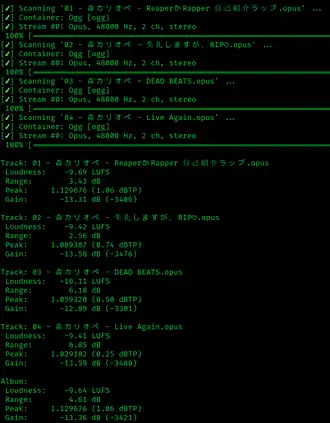 - ↑ «GitHub - Moonbase59/loudgain: ReplayGain 2.0 loudness normalizer based on the EBU R128/ITU BS.1770 standard (-18 LUFS, FLAC, Ogg, MP2, MP3, MP4, M4A, AAC, ALAC, Opus, ASF, WMA, WAV, AIFF, WavPack, APE)»