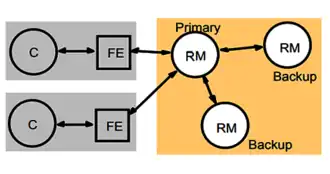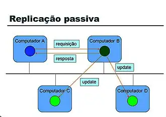 No modelo passivo, ou de backup primário, de replicação para tolerância a falhas, existe, em determinado momento, um único gerenciador de réplica (RM) primário e um ou mais gerenciadores de réplica secundários – backups ou escravos. Na forma pura do modelo, os front-ends (FE) se comunicam somente com o gerenciador de réplica primário para obterem o serviço. O gerenciador de réplica primário executa as operações e envia cópias dos dados atualizados para os backups. Se o primário falhar, um dos backups será promovido para atuar como primário.