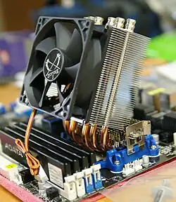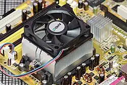 Um componente pode ser encaixado em bom contato térmico com um dissipador de calor, um dispositivo passivo com grande capacidade térmica e com grande área superficial em relação ao seu volume. Os dissipadores de calor são geralmente feitos de um metal com alta condutividade térmica, como alumínio ou cobre,[19] e incorporar aletas para aumentar a área de superfície. O calor de um componente relativamente pequeno é transferido para o dissipador de calor maior; a temperatura de equilíbrio do componente mais o dissipador de calor é muito menor do que seria a do componente sozinho. O calor é levado do dissipador de calor por fluxo de ar convectivo ou forçado por ventilador. O resfriamento por ventilador geralmente é usado para resfriar processadores e placas gráficas que consomem quantidades significativas de energia elétrica. Em um computador, um componente gerador de calor típico pode ser fabricado com uma superfície plana. Um bloco de metal com uma superfície plana correspondente e construção aletada, às vezes com um ventilador acoplado, é preso ao componente. Para preencher lacunas de ar mal condutoras devido a superfícies planas e lisas imperfeitas, uma fina camada de graxa térmica, uma almofada térmica ou adesivo térmico pode ser colocado entre o componente e o dissipador de calor.