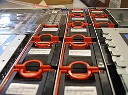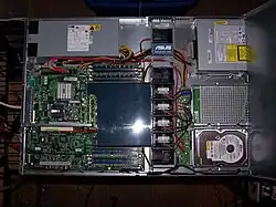 Cada servidor pode ter um sistema de cooler interno independente; Os ventiladores de resfriamento do servidor em gabinetes (1 U) geralmente estão localizados no meio do gabinete, entre os discos rígidos na frente e os dissipadores de calor passivos da CPU na parte traseira. Os gabinetes maiores (mais altos) também possuem exaustores e, a partir de aproximadamente 4U, podem ter dissipadores de calor ativos. As fontes de alimentação geralmente têm seus próprios exaustores voltados para trás.
